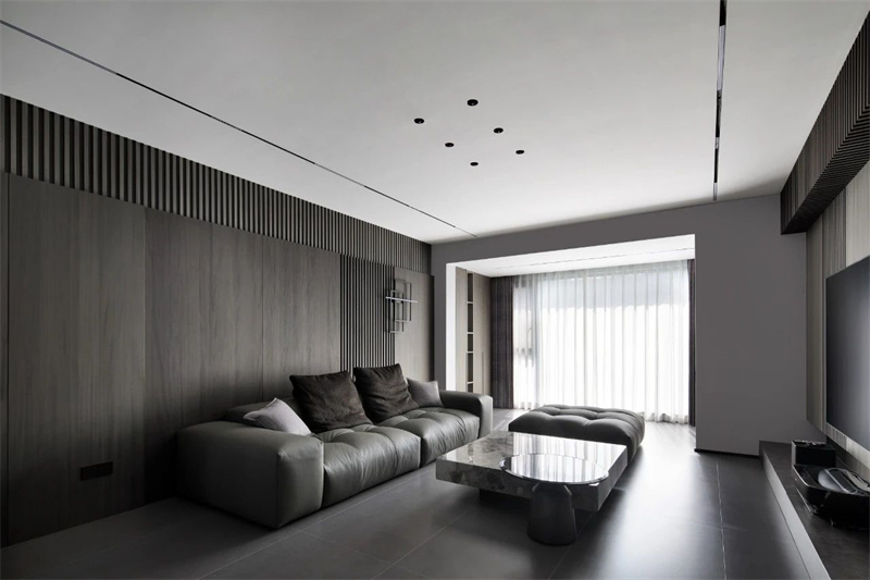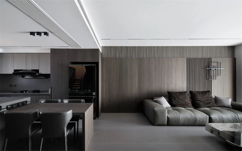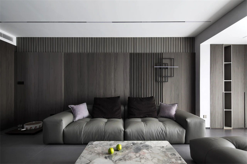 客廳以大面積的灰色調(diào)為主,搭配深色木質(zhì)墻面和地磚,展現(xiàn)出一種低調(diào)的奢華感。灰色皮質(zhì)沙發(fā)線條流暢、造型簡(jiǎn)約,既舒適又不失時(shí)尚感,成為整個(gè)空間的視覺(jué)焦點(diǎn)。大理石茶幾設(shè)計(jì)簡(jiǎn)潔大方,光滑細(xì)膩臺(tái)面反射出柔和的光澤,提升了空間的質(zhì)感與層次。