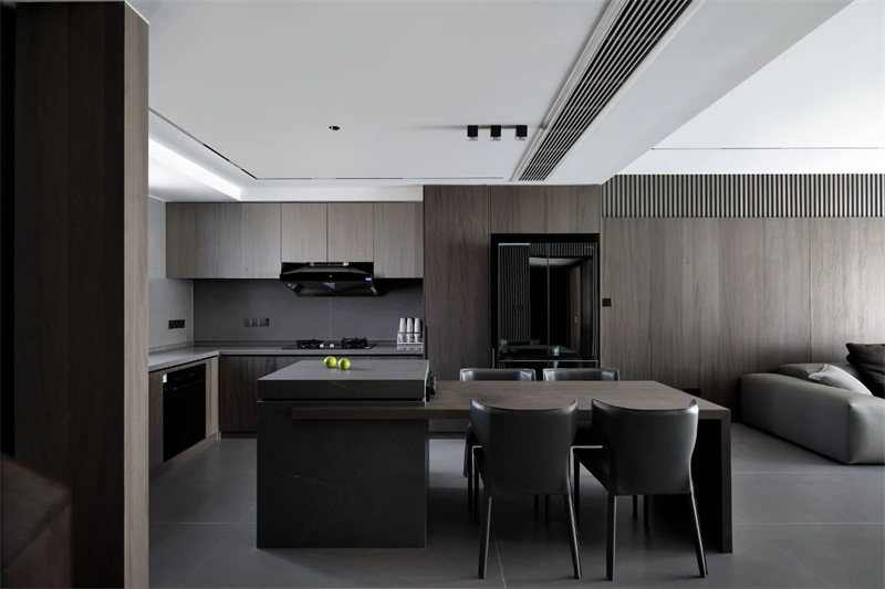 半開(kāi)放式布局方式讓廚房和餐廳融為一體,深色木質(zhì)餐桌搭配灰色皮質(zhì)餐椅,打破傳統(tǒng)餐廳的沉悶,散發(fā)著都市摩登的氣息。獨(dú)特設(shè)計(jì)的燈具投射下的光影,在餐桌上創(chuàng)造出一種浪漫的用餐氛圍,讓每一次的用餐都成為一場(chǎng)視覺(jué)與味覺(jué)的雙重盛宴。
