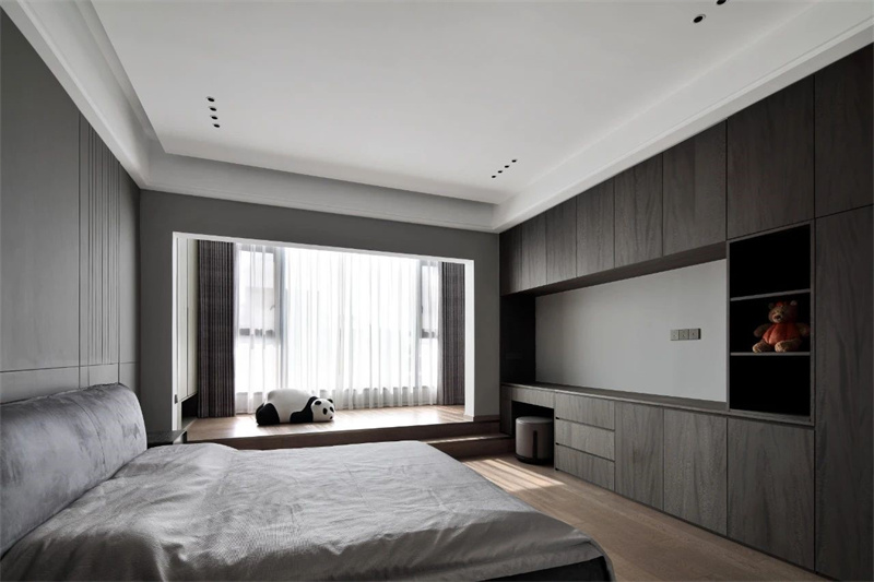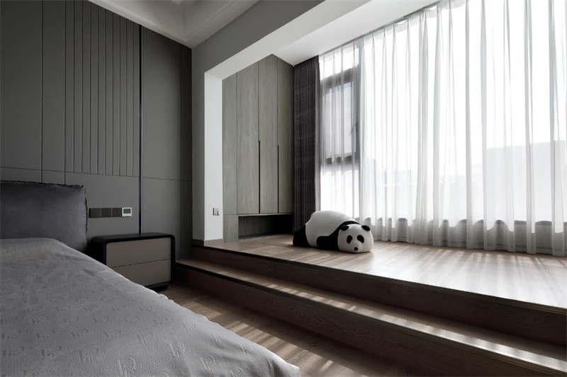 主臥以灰色和白色為主色調(diào),搭配溫暖的木質(zhì)地板,展現(xiàn)出一種低調(diào)的奢華感。床頭背景墻采用豎條紋設(shè)計(jì),增加了空間的層次感和視覺(jué)深度。飄窗設(shè)計(jì)不僅實(shí)用,還為房間增添了一處悠閑的小角落,可以在此享受陽(yáng)光、閱讀書籍或簡(jiǎn)單冥想。