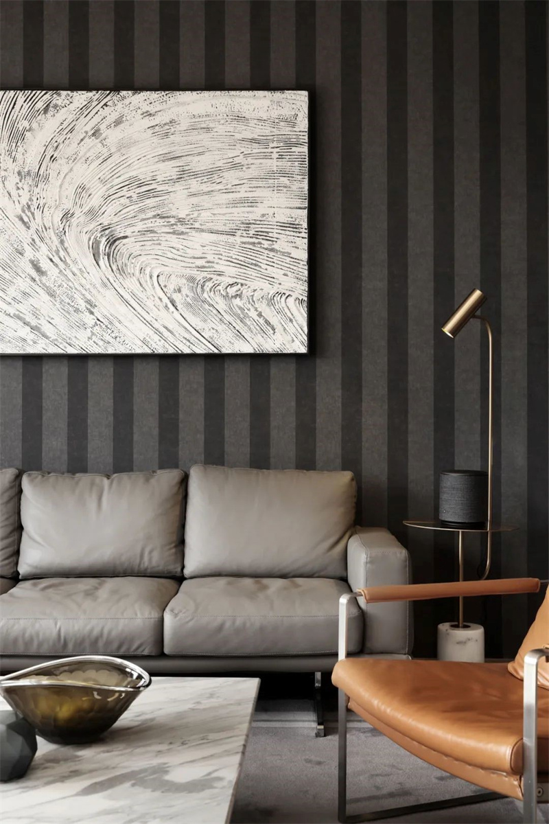 客廳以黑白灰為主色調,搭配木質地板和金屬元素,營造出一種簡潔而高雅的氛圍。背景墻采用豎條格柵設計,不僅增加了視覺上的層次感,還提升了整體空間的質感。墻上懸掛的藝術畫作和雕塑擺件,為客廳增添了幾分藝術氣息和個性魅力。