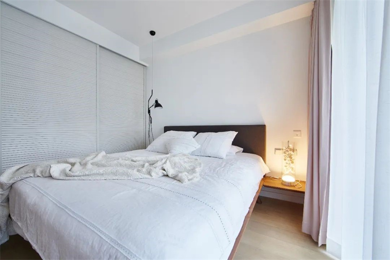 主臥的大飄窗讓人心動,陽光灑入、微風幾許一片歲月靜好,暖色床品、軟裝掛飾搭配,營造出寧靜淡雅的睡眠環境。整體色調偏暖,簡約溫暖舒適,床頭的小臺燈在夜晚照亮屬于自己的小天地。
