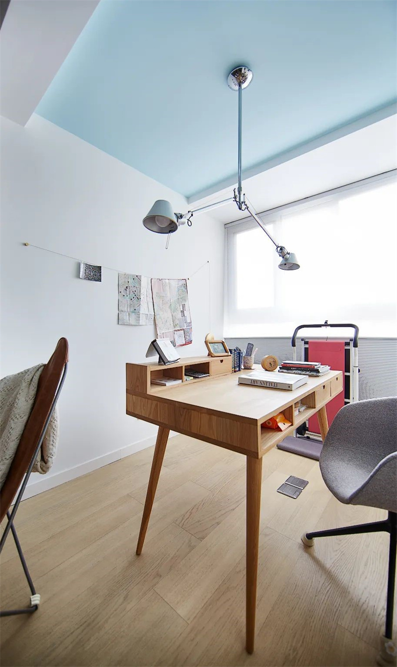 書房視野開闊,白色墻面柜體搭配原木家具、地板,顯得格外的自然協調,書桌與書柜一體化,擴大了收藏空間。桌面上擺放著書籍、文具和一些小物件,既實用又美觀,讓整個空間充滿了生活氣息。