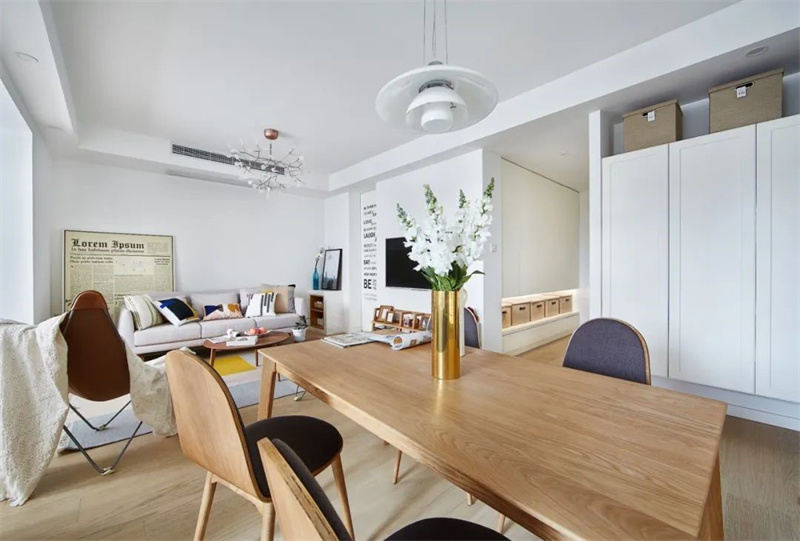 客餐廳整體以白色和原木色為主,搭配同色系的家具顯得一致協調,配合暖色燈光,分外溫馨,墻上的掛飾加上餐桌上的花卉,每一處細節都經過精心布置,充滿了儀式感。