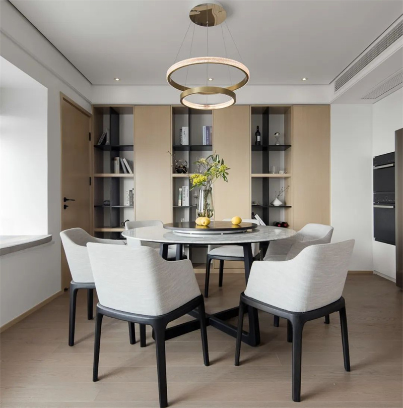 現代風格的餐廳延續整體簡約基調,圓形大理石餐桌搭配灰色餐椅,質感溫潤又不失高級感。上方雙層圓環吊燈造型獨特,暖光灑落,營造出溫馨的用餐氛圍。一旁的墻面裝飾與開放式置物架增添生活細節,功能與美感兼具。
