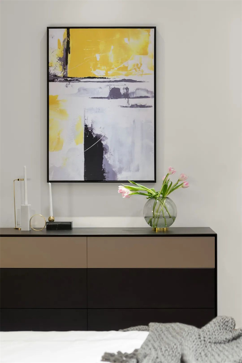 主臥以簡潔線條和低飽和色調,營造出寧靜舒適的睡眠氛圍。落地窗引入充足采光,視野開闊,連接室內外的寧靜時光。一側設置小型工作角,書桌搭配亮色單人椅,兼顧實用與設計感。床頭壁燈、香薰與裝飾擺件點綴其間,細節中透露著生活溫度。