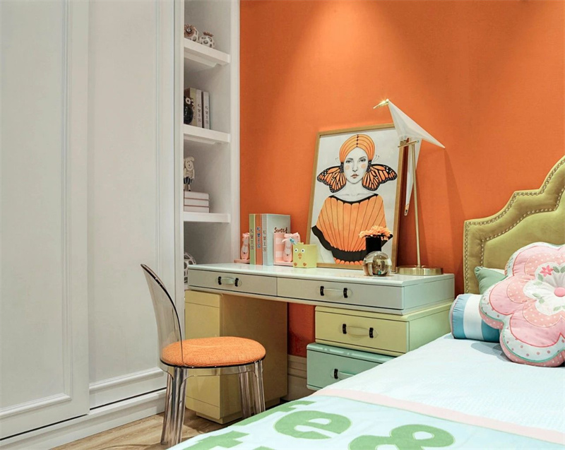 兒童房充滿溫馨與活力,設計簡潔卻極具趣味性。房間的主色調以橙色為主,配合原木色地板,營造出輕松愉快的氛圍。床頭設置了一張書桌,陽臺明亮的光線灑入室內,為孩子提供了理想的學習和游戲區域,增添了童趣和活力。