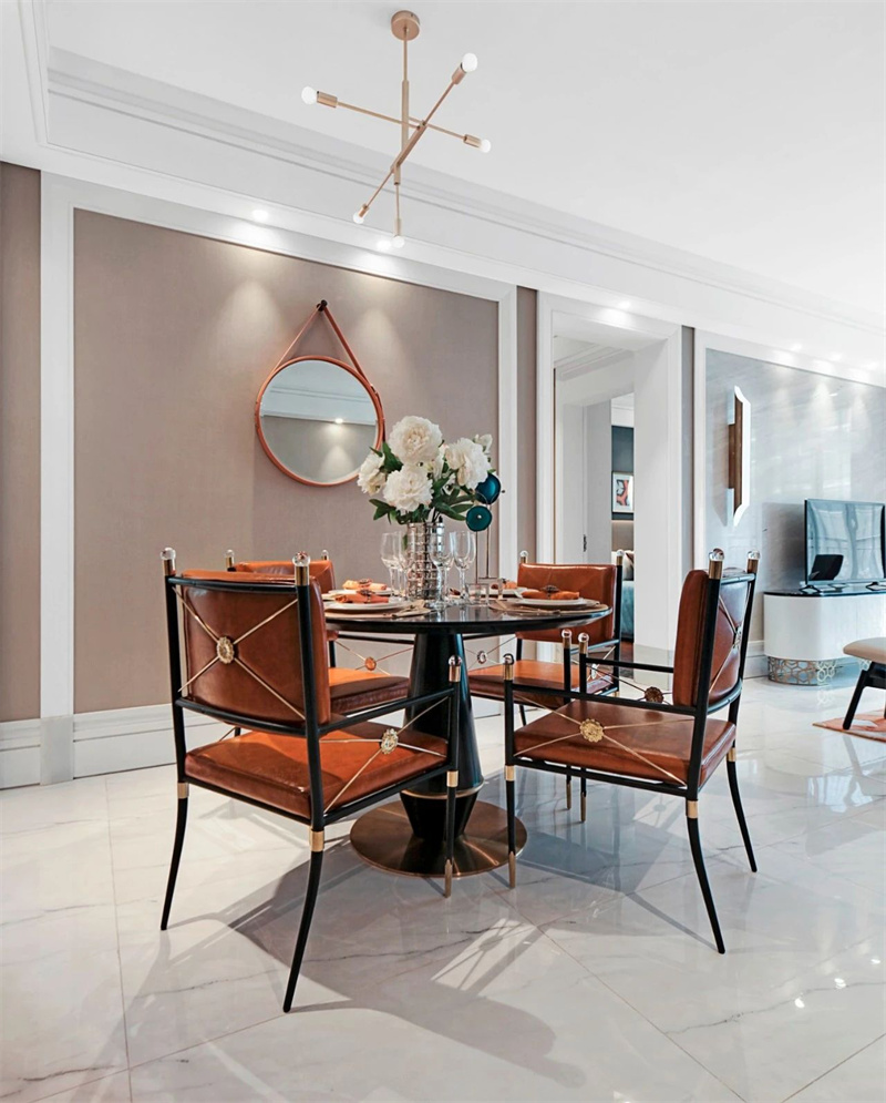 餐廳設計講究細節與品質的融合。中央的餐桌簡潔大氣,圍繞它擺放著幾張極具辨識度的愛馬仕橙色餐椅,與同色系的裝飾品相互呼應,為餐廳增添了一絲活力和時尚感。餐桌上精致的餐具與花藝裝飾,為每一餐的時光賦予滿滿的儀式感。