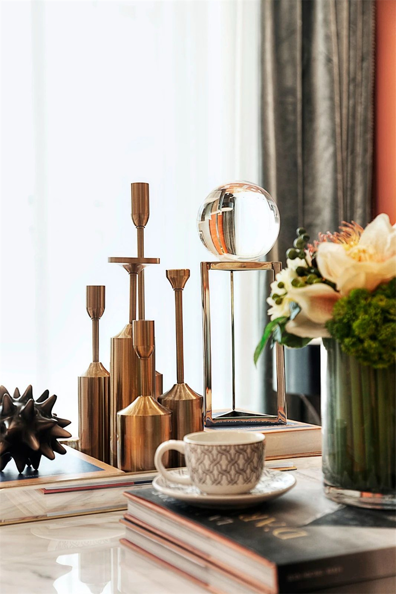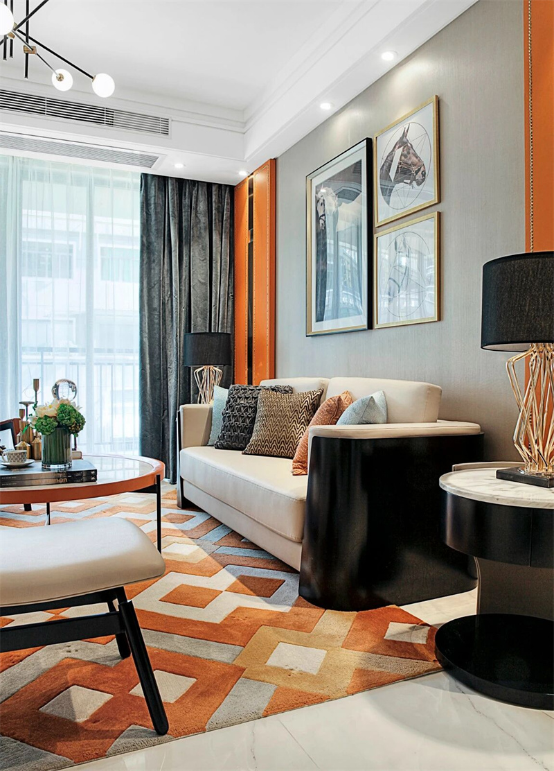 客廳的設計完美詮釋了法式輕奢的精髓,一張極具視覺沖擊力的愛馬仕橙色地毯鋪陳于大理石地面上,與淺米色的沙發和金屬質感的茶幾形成鮮明對比,營造出層次分明的視覺效果。柔和的燈光與古典裝飾掛畫,為整個空間增添了一份溫暖的浪漫氛圍。