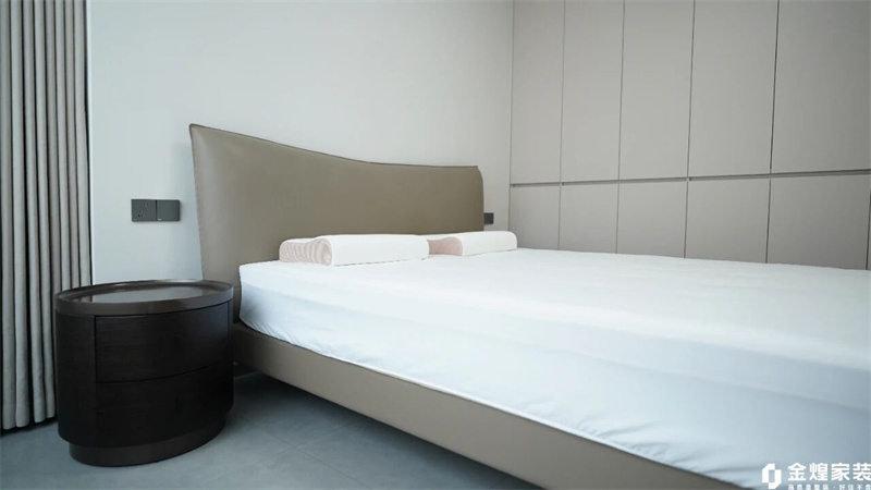 主臥采用了極簡的設計語言,白色墻面搭配灰色地磚,配合大面積的落地窗,營造出寬敞明亮的空間感。簡約風格的皮藝床,搭配質感柔和的床品,營造出寧靜且優雅的休息氛圍。