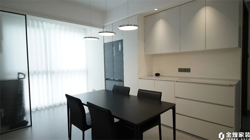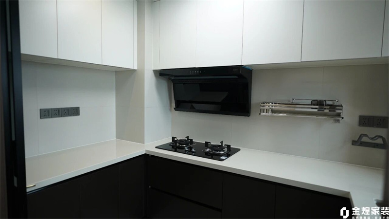 廚房整體采用黑白搭配,營造出整潔利落的視覺效果。U型布局讓空間利用率最大化,操作流暢且方便。嵌入式的廚電設計進一步優化了空間,簡約的設計不僅讓廚房看起來明亮,也提升了烹飪時的舒適感。