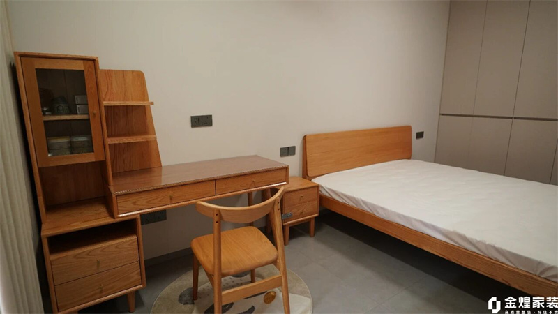 次臥更注重實用與自然質感。采用整套原木色家具,搭配柔和的燈光設計,讓整個空間顯得舒適宜人。書桌的設計簡潔大方,同時配有多功能儲物柜,既節省空間,又增加了實用性。