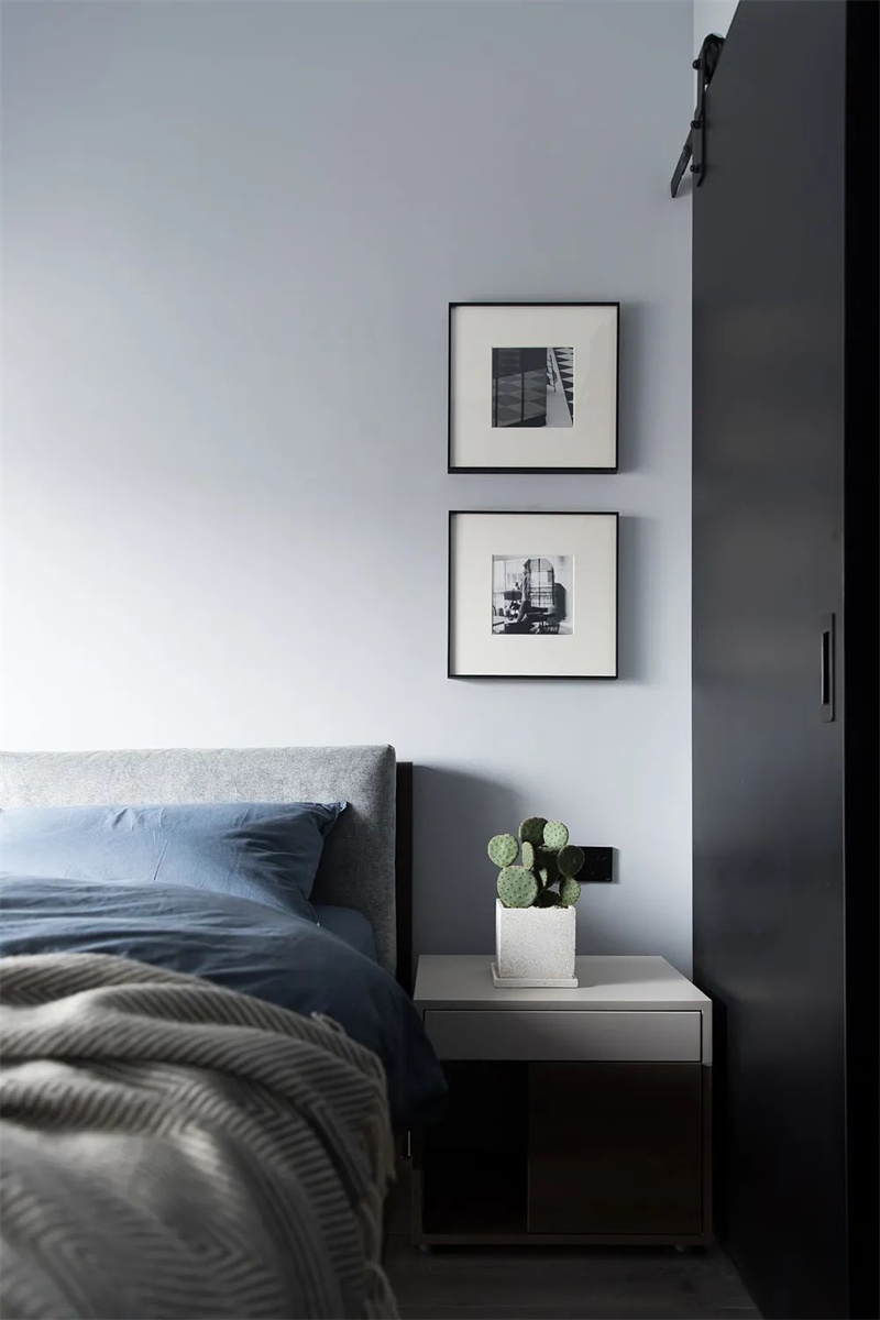 主臥室延續(xù)了整體的極簡(jiǎn)風(fēng)格,以淺灰色和白色的搭配為主,消除了多余的裝飾元素。深色的定制柜和藍(lán)灰色的床品為臥室注入了寧?kù)o的舒適感。通過精心設(shè)計(jì)的照明,臥室的空間質(zhì)感和氛圍得以突顯,使簡(jiǎn)潔的設(shè)計(jì)與窗外的自然景色相得益彰。