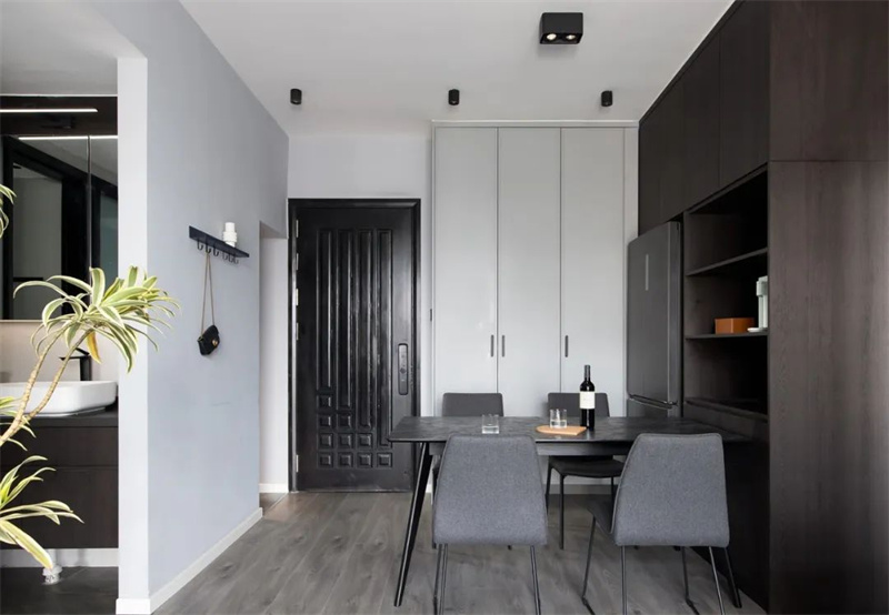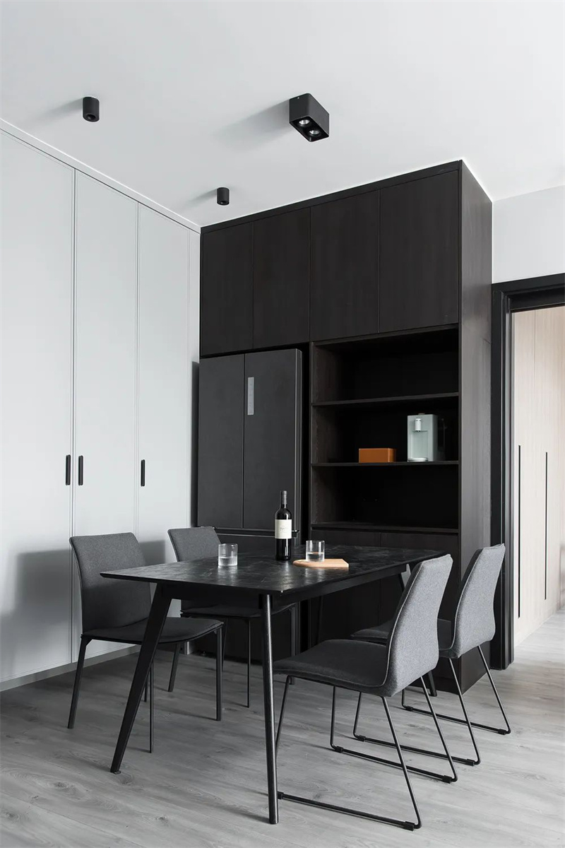 餐廳延續(xù)了整體的簡(jiǎn)約優(yōu)雅設(shè)計(jì)風(fēng)格,以黑色大理石臺(tái)面的餐桌為中心,配以灰色布藝餐椅。旁邊的餐邊柜和嵌入式冰箱完美融合,使整個(gè)空間顯得清新、簡(jiǎn)約和寬敞舒適。