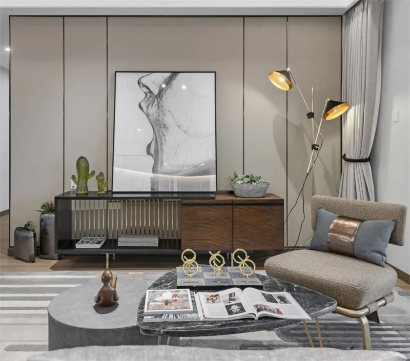 本案采用灰白中性色搭配原木地板為主色調,營造清新簡約的空間氛圍。室內家具選用了簡約設計的灰白色系,搭配金屬材質的細節裝飾與綠植,使整體空間更顯現現代感和奢華感。