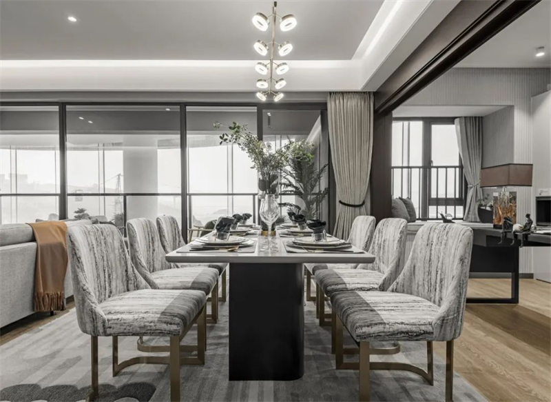 餐廳延續了客廳的風格,餐邊柜將定制柜的美觀與實用性發揮得淋漓盡致?,F代感十足的燈具將溫暖的光線投射到大理石餐桌和布藝餐椅上,營造出舒適的用餐氛圍。