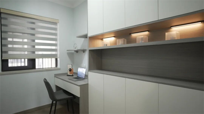 書房以簡潔實用為主,淺藍墻面搭配木紋與白色柜體,營造安靜專注的氛圍。一張簡約書桌,搭配舒適座椅,光線充足,適合閱讀與辦公。上方定制儲物柜結合開放格與隱藏燈帶,既提升收納能力,又增添空間層次感。
