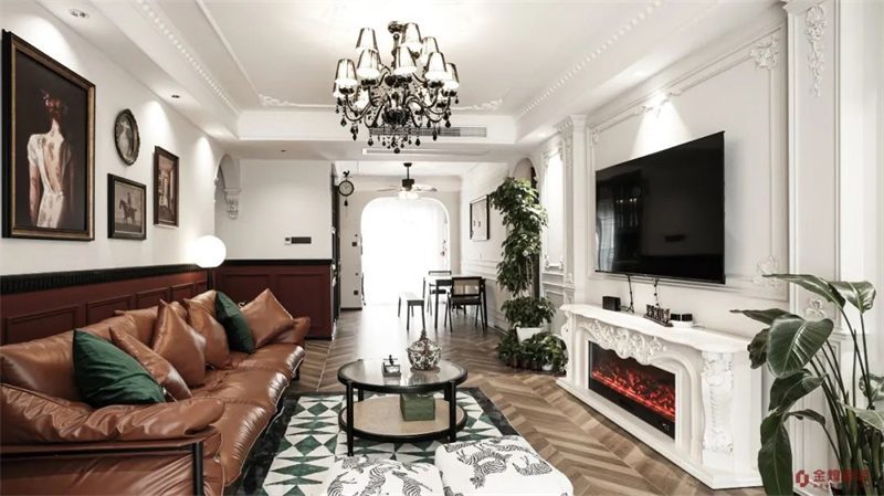 全屋整體配色以大面積的墨綠與棕咖調相結合,再搭配具有復古韻味的家具。在精致的燈飾映襯下,法式情調和復古氛圍在空間中得以巧妙融合。寬廣的飄窗帶來極佳的采光,使整個公共區域充滿通透感,舒適明亮。